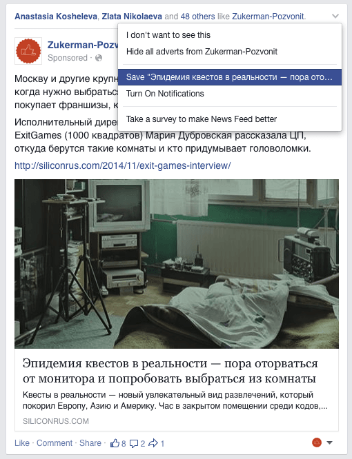 Если вы увидели в новостной ленте интересную ссылку, но у вас нет времени прочитать материал сейчас, то его можно сохранить, чтобы почитать потом. Данная функция работает и в десктопной, и в мобильной версии. Достаточно воспользоваться соответствующей функцией меню, которое прячется за стрелочкой в правом верхнем углу каждой записи.