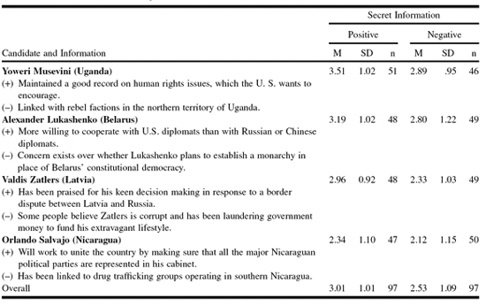 В результате эксперимента оказалось, что американцы выражали более существенную поддержку Лукашенко в том случае, если секретной была положительная информация (индекс 3,19 вместо 2,80 в таблице). Другими словами, добавление грифа «Секретно» субъективно искажает свойства информации, повышая ее важность и ценность.