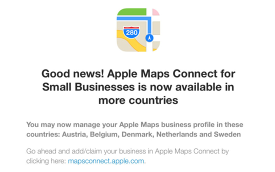 Сервис Apple Maps Connect, позволяющий компаниям создавать карточки со своими данными и прикреплять их к картам Apple, заработал еще в пяти странах мира. Со вторника необходимые данные визуально разместить на карте могут компании из Австрии, Швеции, Дании, Бельгии и Нидерландов. В марте сервис расширил географию на Италию, Швейцарию и Мексики, в феврале – на Канаду, Францию и Германию, а месяцем ранее – на Великобританию, Австралию, Ирландию, Сингапур и Новую Зеландию.