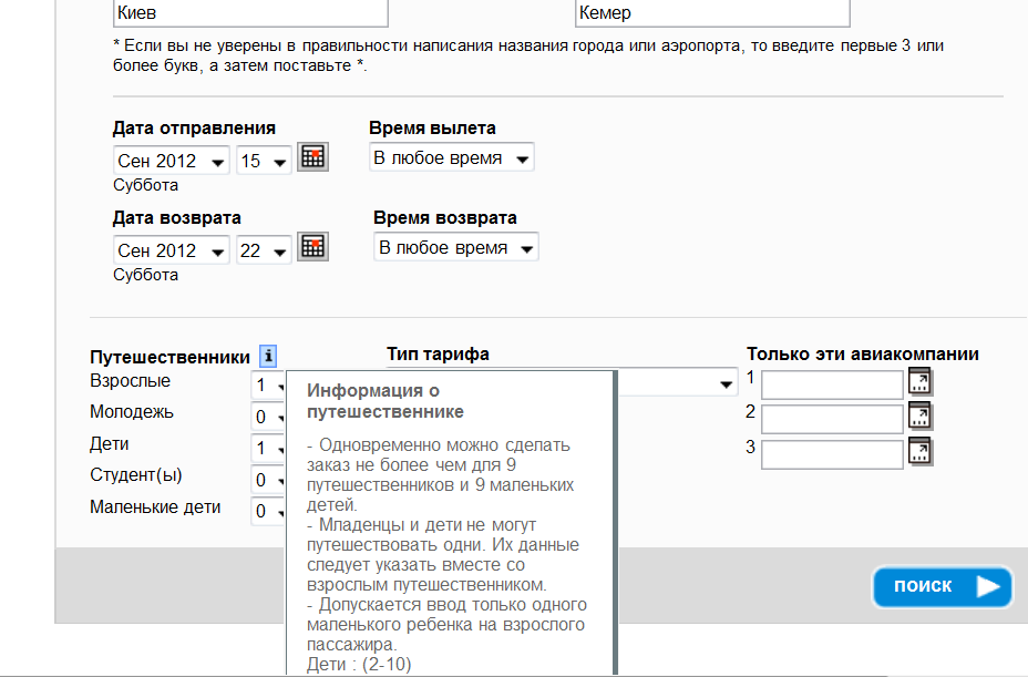 Можно воспользоваться расширенный поиском. Который предусматривает выбор авиакомпании ( список не велик) и тип поиска на основе общей стоимости. Сижу и радуюсь – вот оно – счастье моё – сейчас будет. В пункте назначения предлагают ввести «название города ИЛИ код аэропорта». Ввожу название города Кемер. И получаю разочарование: