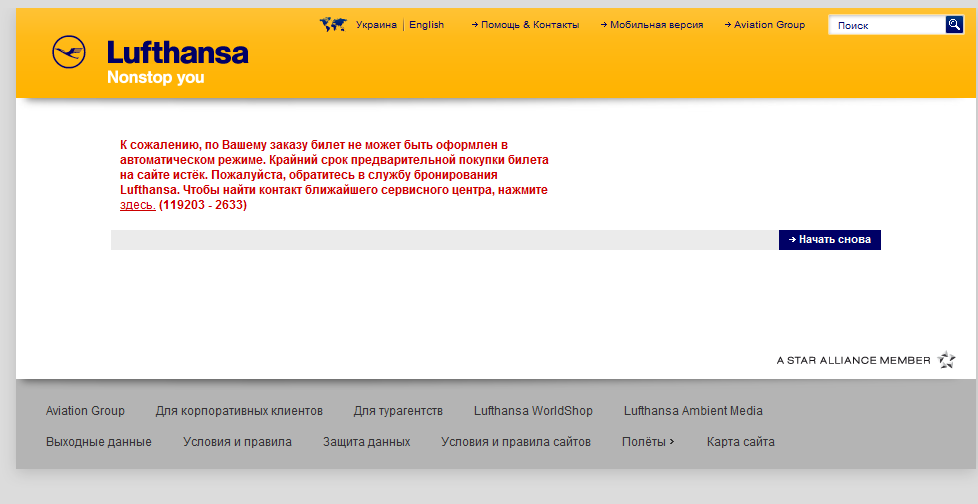Компания Lufthansa имеет даже мобильную версию сайта. Попытка забронировать билет закончилась сообщением