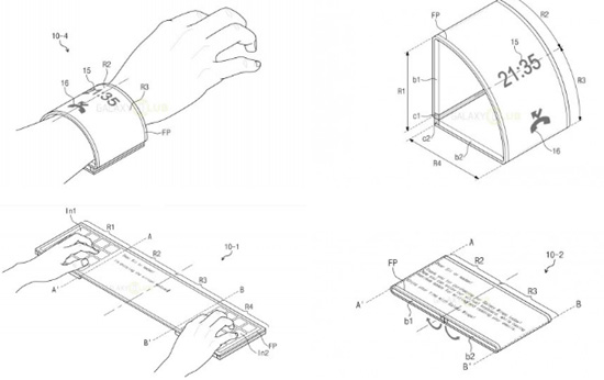 В новых патентах показано, как вытянутый девайс можно сгибать и носить на руке в виде браслета, использовать в качестве виртуальной клавиатуры или настольных часов. Каким же будет реальный первый сгибаемый смартфон от Samsung - пока не ясно.