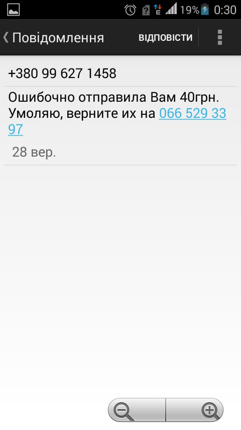 “От як нас стараються розвести… Потрібно уважно читати смс. Добре, що я здогадалась, що мене обманюють в хочуть видурити гроші”, – написала у Facebook кременчанка Юля Мельничук.