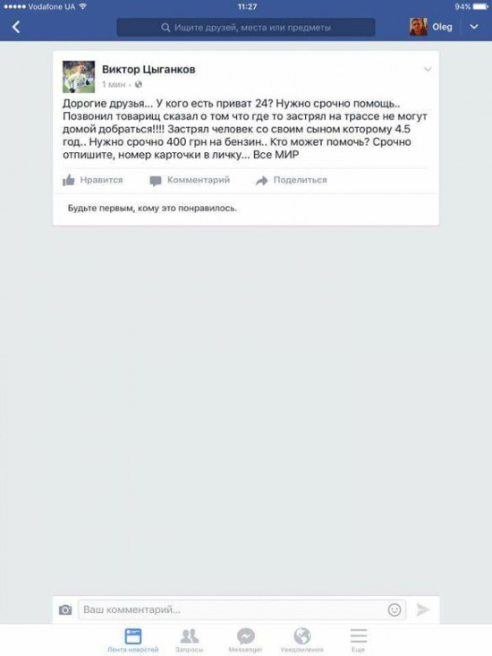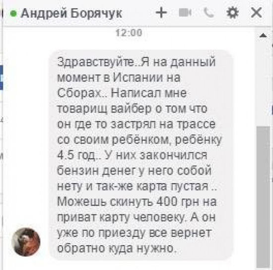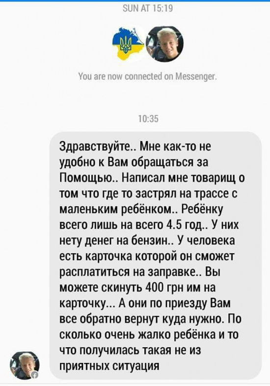 У всіх одна історія: товариш застряг на трасі з маленькою дитиною. І просять 400 гривень на бензин, нібито потім повернуть.