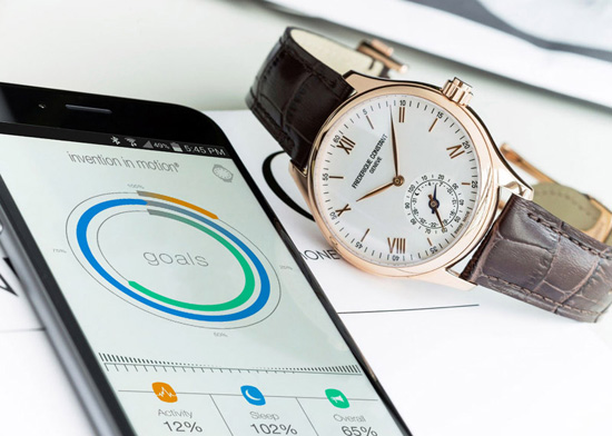 Swiss Horological Smartwatch от компании Frederique Constant – кварцевые часы c классическим циферблатом – способны сопрягаться со смартфонами. Среди прочего, они способны замерять физическую активность своего владельца. Часть этих показаний отображается на циферблате часов, основная – на дисплее мобильного устройства.