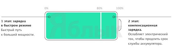 Подзарядка АКБ состоит из двух фаз. Во время первой — с 0 до 80% — батарея пополняется энергией быстро (точное время зарядки зависит от того, используется ли устройство, настроек и других факторов). Вторая — с 80 до 100% — называется компенсационной, она «ослабляет» электрический ток и тем самым позволяет продлить срок службы АКБ iPhone.