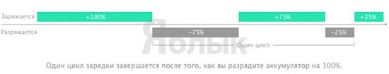 Один цикл — это когда вы разряжаете свой iPhone со 100% «в ноль». Это можно сделать как за один раз, так и за несколько. Пример: за день батарея разрядилась на 75%. Вы зарядили его до 100% и продолжили пользоваться. Один цикл подзарядки закончится тогда, когда вы израсходуете еще 25% заряда («вчерашние» 75% + «сегодняшние» 25%).