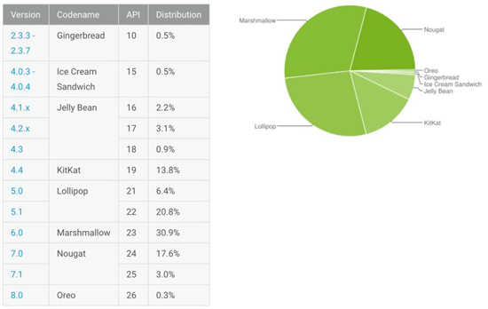 Поисковый гигант Google обновил свою статистику по распространению различных версий операционной системы Android. Естественно максимум внимания темпам распространения Android Oreo, финальная сборка которой появилась в августе. К сожалению, результат неутешительный и за октябрь месяц ее присутствие на рынке выросло всего на 0,1%, достигнув отметки в 0,3% Android-устройств, работающих под ее управлением. Это наихудший результат среди всех версий операционной системы и «печенька» уступает даже таким древним платформам как Gingerbread и Ice Cream Sandwich.