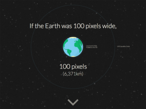 Веб-сайт под названием “Distance to Mars” (“Расстояние до Марса”) наглядно демонстрирует, сколько пикселей придется пролететь землянину, чтобы достичь Красной планеты. За абсолют в 100 пикселей взят диаметр Земли, который по-настоящему равен 12 756 километрам.