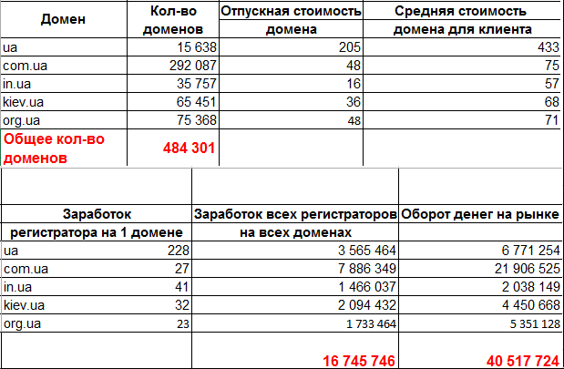 Еще свыше 200 тысяч доменов зарегистрировано в региональных зонах. При средней стоимости такого домена в 60 грн., к предыдущим расчетам мы добавили еще 13,4 млн. Получившаяся цифра в 54 млн. грн. и составляет объем доменного рынка Украины. Заработок доменных регистраторов - около 24 млн. гривен на всех.
