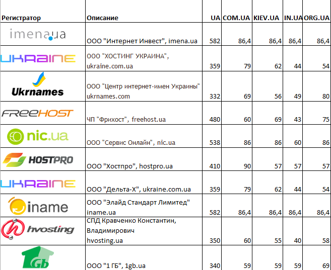 По состоянию на 1 июня цены на домены среди топ-10 регистраторов (согласно рейтингу «Пузомер» от «Хостмастера», который формируется по количеству платных операций) выглядят следующим образом: