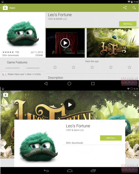 Журналисты Android Police, которые часто публикуют утечки информации о мобильных продуктах Google и редко ошибаются, показали скриншоты интерфейса Google Play с использованием Material Design. Известно, что это не финальный вариант оформления магазина, но в целом примерно так осенью он будет выглядеть. В целом интерфейс станет более ярким, появится больше изображений и возможностей для предварительного просмотра контента. Больше изображений с новым дизайном и сравнение с актуальной версией магазина можно увидеть на сайте Android Police.