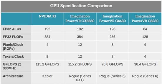Что характерно, в январе NVIDIA представила свой чип Tegra K1, который базируется на архитектуре Kepler и также обладает 192 графическими ядрами CUDA. В NVIDIA тогда отметили, что ее новые процессоры в три раза производительнее Apple A7. Анонсируя PowerVR GX6650, в компании Imagination Technologies заявили, что их решение опережает по производительности и энергоэффективности Tegra K1.