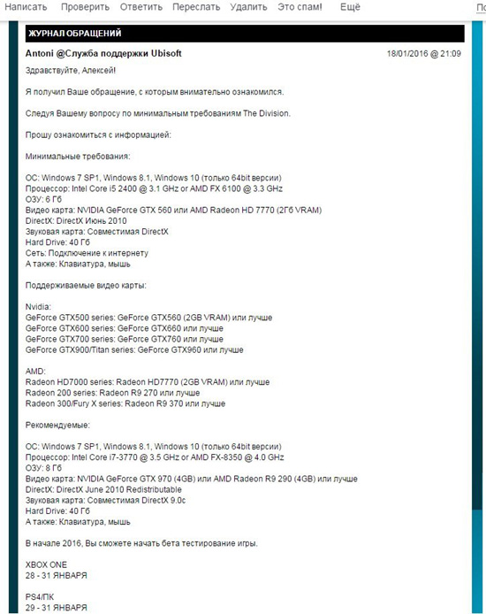 Разработчики Tom Clancy’s The Division готовятся к выходу на бета-тестирование, однако геймеры все еще не знают, какие системные требования будут у игры. В отсутствии анонса официальных требований один из игроков решил обратиться в службу поддержки российского рукава Ubisoft, которая радушно слила в сеть характеристики PC, требуемые для игры.