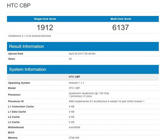 В базе данных тестового пакета GeekBench был протестирован смартфон под названием HTC CBP, который, вероятнее всего, будет представлен под названием HTC U 11.