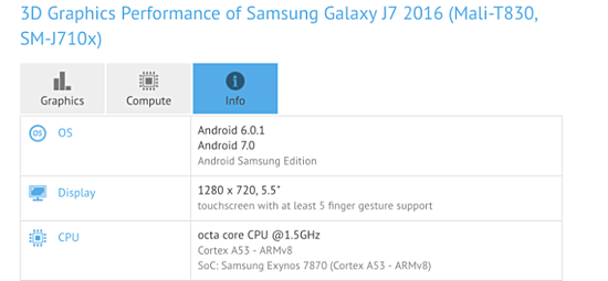 По словам источника, смартфон Samsung Galaxy J7 (2016) скоро получит ОС Android 7.0 Nougat. Об этом свидетельствует появление этого аппарата с новой версией ОС в базе данных GFXBench. Вероятнее всего, производитель уже приступил к тестированию обновления.