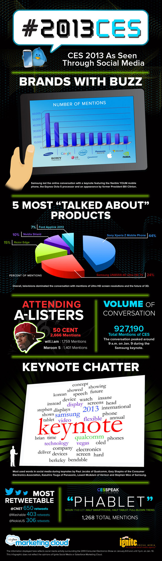 Компания Salesforce Marketing Cloud опубликовала инфографику, которая отражает популярность компаний, анонсированных продуктов и гостей выставки CES 2013. Первое место среди самых обсуждаемых компаний заняла Samsung, за которой следует Sony. Со значительным отставанием от лидеров идут Google, LG, Intel, Qualcomm, Panasonic, Apple, Microsoft и NVIDIA.