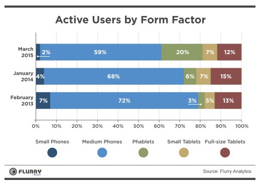 … – планшетофон. Да, сверхбольшие смартфоны постепенно теснят на рынке и обычные смартфоны, и планшеты. Эта тенденция, на которую многократно обращали внимание аналитики, имеет вполне убедительное статистическое подтверждение: по данным Flurry за март 2015 года, доля планшетофонов в общей массе устройств увеличилась более чем в три раза за год.