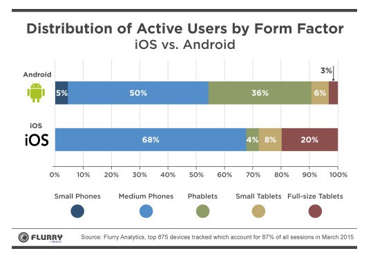В январе 2014 года только 6% активных пользователей мобильных устройств использовали планшетофоны против 68% у «средних телефонов» (устройства от 3,5 до 4,9 дюйма). В марте этого года на планшетофоны приходится уже 20% всех устройств, тогда как средние телефоны снизились до 59%.