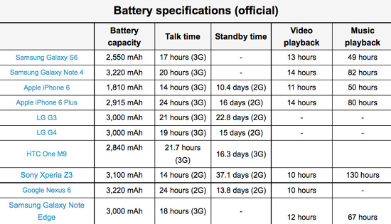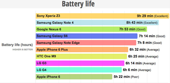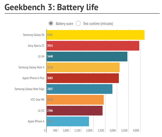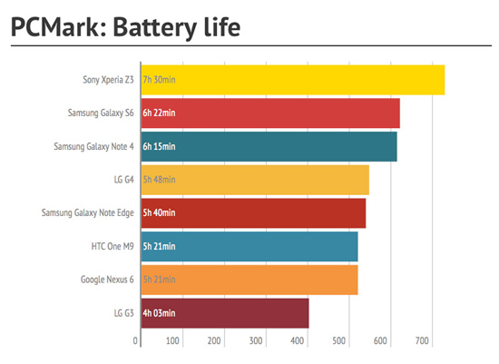 Издание PhoneArena определило лучшие по времени автономной работы флагманские смартфоны, исходя из результатов трех различных тестов — Geekbench 3 от компании Primate Labs, PCMark от Futuremark и собственного теста. Показатель оценивался из различных методов тестирования, включая использование абстрактных алгоритмов и имитации реальной эксплуатации.