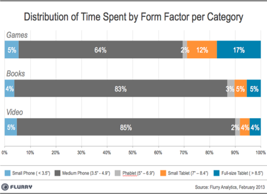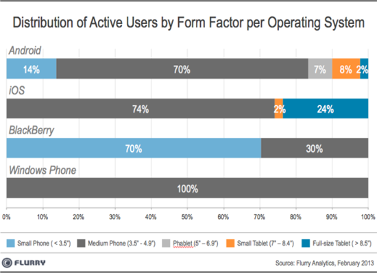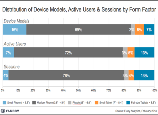 Основываясь на таком разделении, аналитики Flurry пришли к выводу, что доля «фаблетов» на рынке ничтожно мала. Она не превышает 2-3%, в зависимости от модели использования. Зато целых 69% приходятся на смартфоны с диагональю экрана от 3.5 до 4.9 дюймов, а крохи с диагональю менее 3.5 дюймов завоевали 16%. Планшеты с диагональю экрана от 7 до 8.4 дюймов досталось 6%, а здоровякам — 7%.