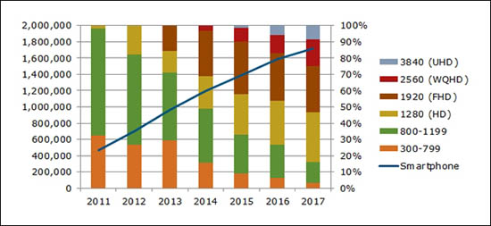 В 2015-м, как ожидается, появятся смартфоны, оснащённые 4K/UHD-экранами с разрешением 2160х3840 пикселей. Поставки таких аппаратов, по прогнозам, в следующем году могут достичь 23 млн штук. На долю смартфонов с 4K-экранами в 2015-м придётся более 5% продаж в Северной Америке и около 5% в Западной Европе. В 2017 году доля таких аппаратов в общей массе продаж приблизится к 10%.