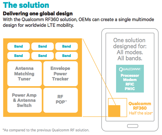 До недавнего времени компания оставалась в тени, когда дело заходило до ряда радиочастотных компонентов, лежащих между сигнальным процессором и антеннами. Здесь свой бизнес вели игроки вроде RF Micro Devices, Avago Technologies и Skyworks. Однако в прошлогоднем феврале Qualcomm представила комплексный связной пакет RF360, призванный не только устранить конкурентов, но и снизить общее энергопотребление смартфонов, уменьшить занимаемый объем их драгоценного внутреннего пространства и, самое главное, устранить проблемы фрагментации частот LTE-коммуникаций.