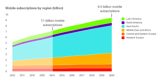 К 2020 году на Земле будет 26 млрд устройств с доступом к интернету и 6,1 млрд пользователей смартфонов. Это приведет к быстрому развитию мобильного интернета, к которому через пять лет будет подключено 90% территории планеты. При этом 80% новых подключений к мобильной сети придется на развивающиеся страны, где пользователи уже сегодня активно скупают дешевые устройства.