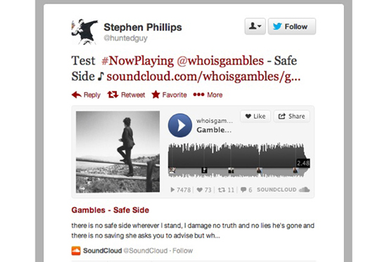 Сайт Twitter научился проигрывать музыку в октябре 2012 года. Если пользователь опубликует ссылку на песню в Soundcloud, твит можно будет «развернуть» и прослушать композицию, не переходя на другую страницу.