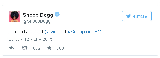 Американский рэпер Снуп Дог (Snoop Dogg) заявил о своей готовности возглавить компанию Twitter. Об этом он написал в своем микроблоге.
