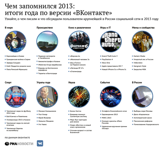 Соцсеть «ВКонтакте» составила рейтинг самых обсуждаемых ее пользователями тем 2013 года, сообщает Digit.ru. Среди международных новостей самым популярным событием стал Евромайдан в Киеве, на втором месте – гражданская война в Сирии, на третьем – разоблачения Эдварда Сноудена. Среди российских – выборы мэра Москвы, дело «Кировлеса» и «антипиратский» закон.