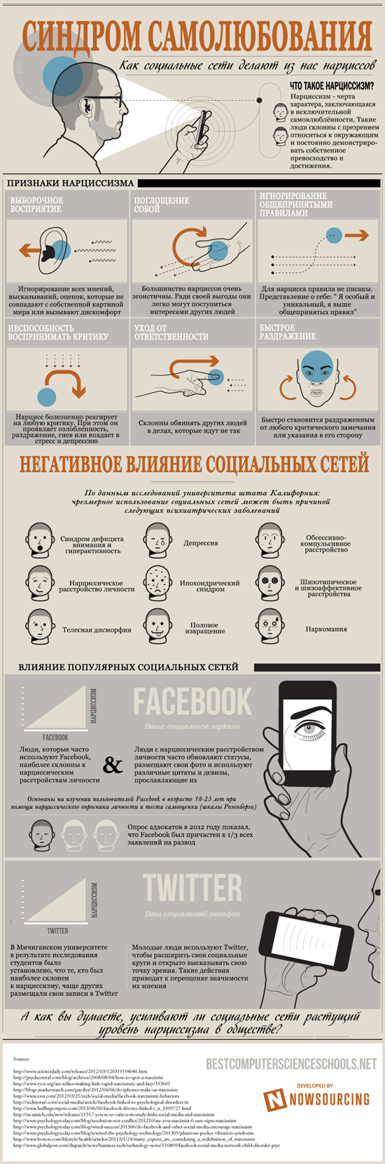 Но и это еще не все. Согласно последним исследованиям, чрезмерное времяпровождение в социальных сетях приводит и к более глубоким изменениям в психике. В том числе, появлению нарциссизма, который врачи рассматривают как серьезную личностную дисфункцию. Подробнее об этом вы узнаете в нашей новой инфографике.