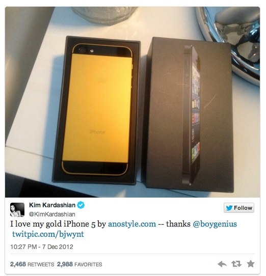 Прозвище было выбрано в честь светской львицы Ким Кардашян. Данная информация была выявлена репортером New York Times Ником Билтоном — он опубликовал ее в твиттере. Около года назад актриса получила в подарок золотой iPhone 5, не стала долго думать и похвасталась обновкой в своем блоге. Естественно, iдевайс был перекрашен сторонней фирмой, подобный редизайн не является новинкой и широко распространен на рынке.