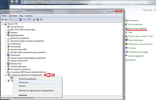 Первое, что вы можете сделать - отключить веб-камеру программно. Для этого зайдите в «Панель управления», откройте «Диспетчер устройств», найдите там свою камеру (вероятнее всего, она будет находиться в подразделе «Устройства обработки изображений»), щелкните по названию устройства правой кнопкой мыши и выберите пункт «Отключить».