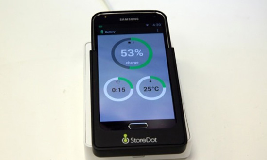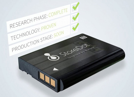 Компания StoreDot, специализирующаяся на электронных компонентах на основе биоорганических материалов, придумала свой вариант решения этой проблемы. Заключается он в использовании собственной технологии «наноточек» (NanoDots) при создании аккумуляторов. Это позволяет практически мгновенно, по современным меркам, заряжать смартфоны и планшеты, которые будут использовать новые аккумуляторы. На полную зарядку батареи будет уходить не более одной минуты. В обычной жизни, как известно, этот процесс занимает 2-3 часа.