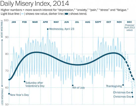 Американский аналитик Кристофер Ингрехем (Christopher Ingraham), используя инструмент Google Trends, выстроил годовой «график счастья» пользователей Интернета.