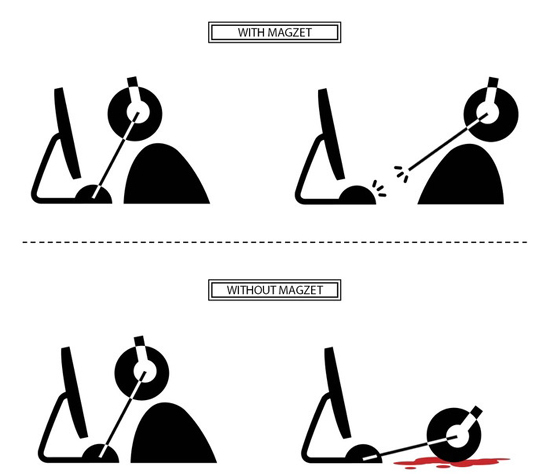 Созданный разработчиками Джоном Хелстеном и Джефом Рассалом разъем для наушников MAGZET работает по принципу MagSafe. Его особенность состоит в том, что коннект удерживается на месте одними магнитами, поэтому если кто-то случайно задевает шнур iPhone или iPad, кабель просто отстегивается от мобильного устройства, что снижает риск падения и повреждения.