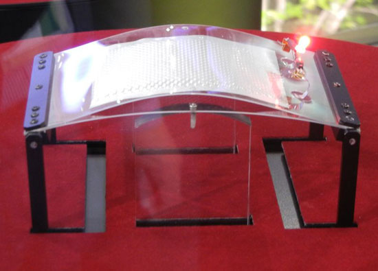 Помимо аккумулятора в экспозиции Semiconductor Energy Laboratory был представлен и электронный экран, работающий от гибкой батареи.