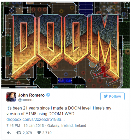 "Прошёл 21 год с того момента, как я сделал уровни для DOOM. Вот моя версия e1m8 для DOOM1.WAD", - написал Джон Ромеро в Twitter.
