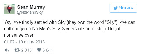 «Ура! Мы, наконец-то, пришли к соглашению с компанией Sky (они владеют словом «Sky»). Теперь мы можем назвать свою игру No Man's Sky. 3 года секретной бессмысленной юридической бессмыслицы позади», — отметил Мюррей.