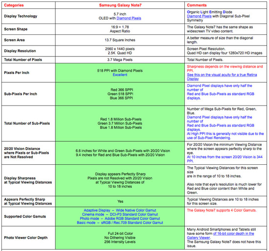 Отчёт DisplayMate огромен и целиком интересен лишь специалистам в этой области. Однако по большинству характеристик Galaxy Note 7 был признан компанией лучшим в индустрии. Панель этого аппарата выполнена по технологии AMOLED и в сопоставлении с моделью в Galaxy S7 превосходит ее по многим параметрам. Так, предельная яркость экрана Galaxy Note 7 равна рекордному для смартфонов значению 1048 кд/м². Самым низким для индустрии оказался показатель отраженного света (4,6%). Дисплей Galaxy Note 7 характеризуется высокой контрастностью при естественном освещении (228) и малым падением яркости экрана в зависимости от угла обзора (21%). Диагональ и разрешение смартфона — 5,7 дюймов и 2560×1440 пикселей.