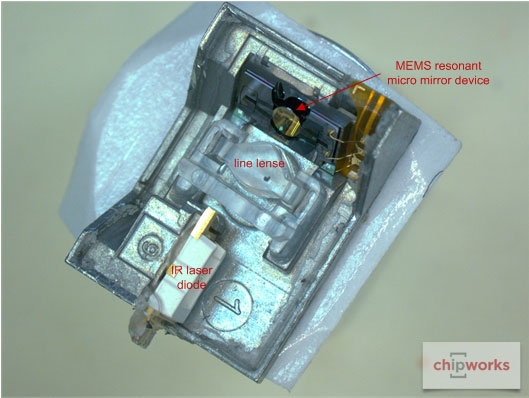 Для исследования блок Intel RealSense был добыт из ноутбука Lenovo ThinkPad Yoga 15. Это первое поколение подобных сенсоров, которые получили коммерческое распространение. Второе поколение камер будет ещё компактнее и даже обещает попасть в смартфоны. На тонкой планке из печатной платы расположен процессор для обработки изображения, датчик для приёма инфракрасного изображения, обычный датчик изображения и инфракрасный проектор. Последний и стал предметом интереса специалистов Chipworks. Всё остальное — это обычные серийные компоненты.