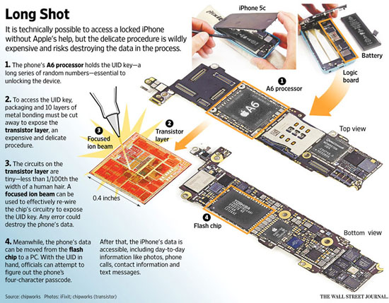 Apple защищает доступ к данным на iPhone с помощью UID и четырехзначного пароля для разблокировки телефона. UID сам по себе взломать нельзя, но если его удастся перенести на сторонний носитель, то спецслужбам останется только подобрать четырехзначный пароль для разблокировки iPhone, говорят в Chipworks. Извлечь ключ, по мнению экспертов можно с помощью ионно-лучевой обработки микропроцессора.