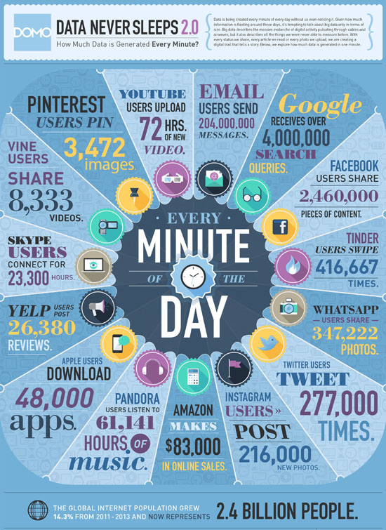 Компания Domo, специализирующаяся на бизнес-аналитике, составила наглядную инфографику о том, как проходит 1 минута во Всемирной Паутине в 2014 году.
