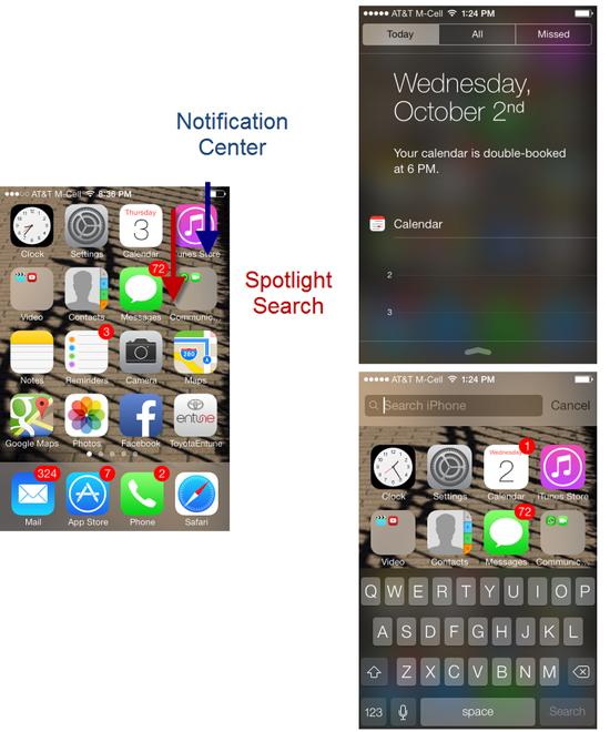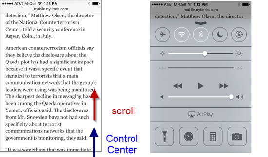 В Nielsen Norman Group отметили полезность центра управления, вызываемого свайпом снизу вверх, но тут же указали, что во время листания страниц в браузере часто можно вызвать центр управления случайно. Лишь немногие пользователи находят в настройках iOS 7 опцию, которая позволяет сделать этот элемент ОС неактивным в открытых приложениях. Точно так же вместо Spotlight жестом сверху вниз можно непреднамеренно вызвать центр уведомлений.