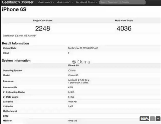 Также был опубликован скриншот с результатами бенчмарк-теста iPhone 6s в Geekbench, где был протестирован процессор Apple A9 с частотой 1,8 ГГц и 2 ГБ оперативной памяти. Обновленная начинка позволила новому смартфону заработать 2248 баллов в одноядерном тесте и впечатляющие 4036 в многоядерном.