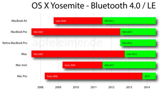 Как выяснили эксперты издания Apfeleimer, Handoff будет работать не на всех компьютерах. Для поддержки технология требуется наличие беспроводного модуля Bluetooth 4.0/LE, впервые реализованного в Mac только в середине 2011 года. Издание составило диаграмму совместимости компьютеров Apple с инновационной технологией.