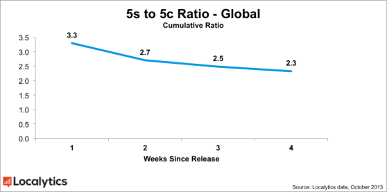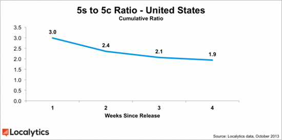 Первоначально отношение проданных в США 5s к проданным 5c составляло 3.0. Сейчас это отношение уже 1.9. По всему миру оно упало с 3.3 до 2.3. Разница в данным по США и в целом объясняется тем, что пользователи в США покупают более дорогие устройства.