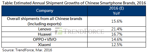 Если взглянуть на китайские бренды, первой стоит отметить компанию Huawei. В 2015 году компания Huawei продала первую сотню миллионов своих смартфонов (108 млн штук). В 2016 году Huawei рассчитывает закрепить успех, не в последнюю очередь благодаря новому флагману P9. По оценкам TrendForce, компания сможет за год продать 130 млн смартфонов, что будет соответствовать годовому росту объёмов на 16,7 %.