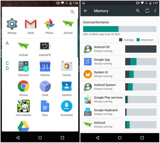 В Android M на вкладке с количеством используемой оперативной памяти появились два новых параметра напротив каждого запущенного приложения. Они отвечают за среднее и максимальное использование ОЗУ приложением.
